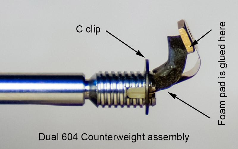 I repaired a Dual 604 turntable and one of the issues was the counterweight flops down quite loose. The counterweight is mounted on a flat spring to not be rigid on the tonearm but it should be parallel with the tonearm and centered in the adjustment shell. Inside the assembly the flat spring is in an "L" shape which attaches the counterweight to the shaft. At a diagonal of the "L" is attached a foam pad "spring" in tension to keep the flat spring in shape. This pad was stuck onto the spring with adhesive backing that has since deteriorated. I removed the pad, cleaned all traces of adhesive, and reglued it with contact cement. After assembly, there is a small inset setscrew which can fine tune the angle such that the counterweight will be parallel to the tonearm shaft and centered in the adjustment shell.