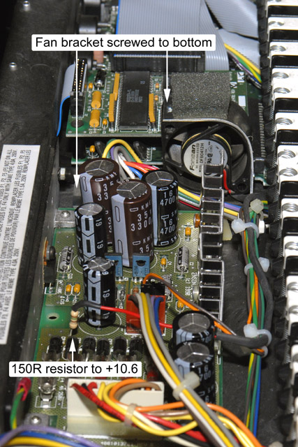 I have two Ensoniq EPS-16 Plus keyboards identical in configuration. One has worked reliably all these years but the second overheats and resets. I had an external fan on the heat sink and decided to install a small +12 volt internal fan. I chose to run the fan off the +10.6 volt unregulated supply that feeds the 7805 regulators as I didn't want to add any more heat to the regulators. There are two small holes between the power supply and the memory/SCSI expander that do not go through the enclosure base. I drilled the one closest to the rear panel through and made a bracket to mount with a 6-32 screw from the bottom. I made the bracket so there would be ~0.25" space between the base and the bottom of the fan for the power supply wires to lay as they are very tight in this area. I added foam under the bracket and a piece on top to press against the front panel PCB to keep the fan from vibrating. The fan runs on ~5.5 volts so it is quiet and exhausts towards the two PCB mounted heat sinks to stir the internal air.