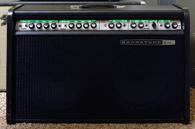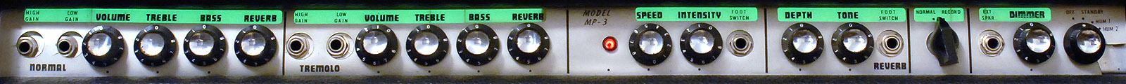 I bought a basket-case Magnatone MP-3 guitar amplifier to restore. All that remained was a partial chassis and a cabinet. There were no tubes, speakers, reverb tank and some of the components had been cut from the chassis. I recovered the cabinet, replaced the grill cloth, repaired the amplifier, and replaced the reverb tank and Jensen speakers some years ago. One of the neat features of this 1966 amplifier was the front panel was rear-lit by electroluminescent panels with a dimmer control! The panels and dimmer control were gone so I had no idea what they looked like or how they were installed. I kept searching surplus sites and years later found some electroluminescent panels that were about the right length. Each panel was made up of three sections so I bought three (two to use and one for a spare). The panel was the perfect length for the right side but too short for the left side. I cut my extra panel off after the first section and used this to extend the left side. These panels are powered from the secondary high voltage side of the transformer through a series limiting resistor and rheostat to control the brightness. The legends looks pretty slick! This picture was taken with normal overhead lighting and the dimmer control on the lowest setting.