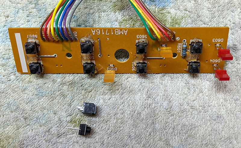 The only switch that would function was the Pause button. The switches are small rubber dome with carbon disks and all the normally used ones had increased in resistance to the point the BA843 tape deck controller IC would no longer recognize them. These switches were 6mm x 6mm and 7mm in height with only two pins. I found some Bojack 6*6*6 tactile switches that had the same footprint but were shorter. I mounted them temporarily on the PCB and assembled the switch mechanism with the pushbuttons. I then reflowed the pad and adjusted the switches so they were just touching the back of the pushbuttons. I then added hot glue around the perimeter to hold the switch in place as they were now about 1.2mm off the PCB. They worked great. You can see the height difference between the original switch and the replacement below it.