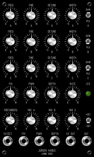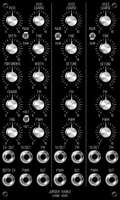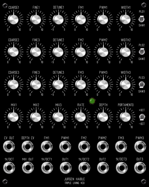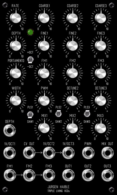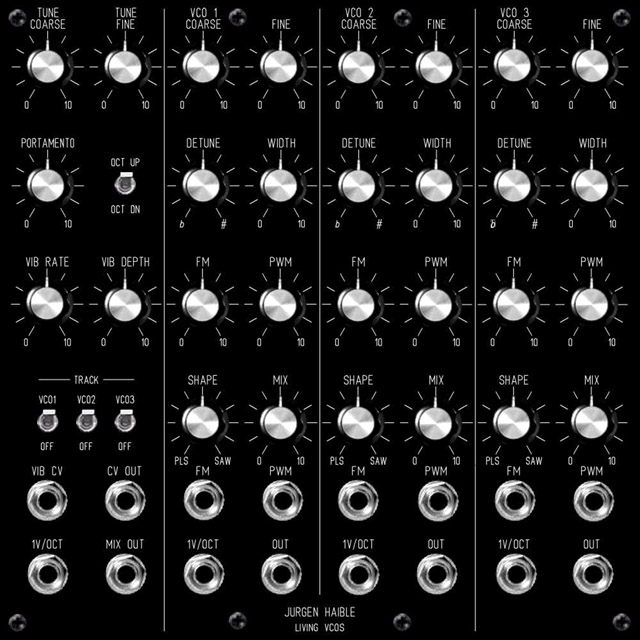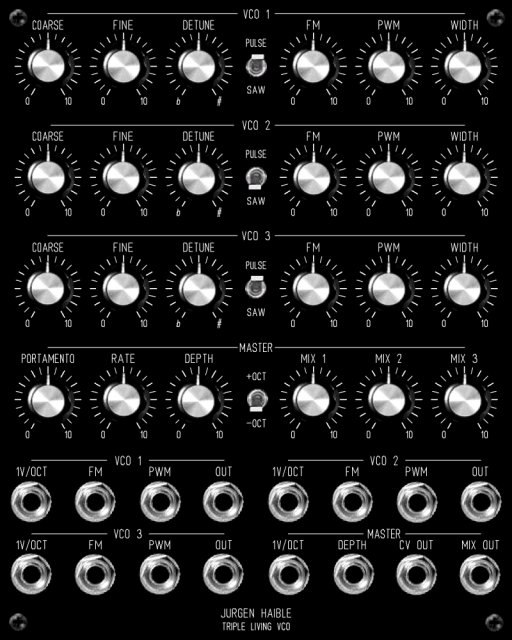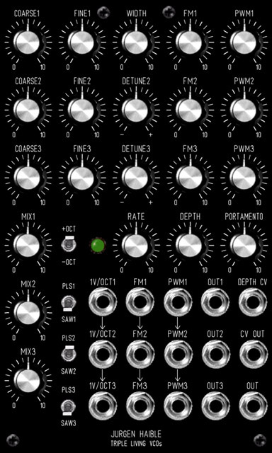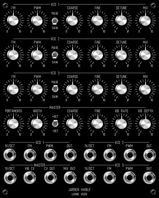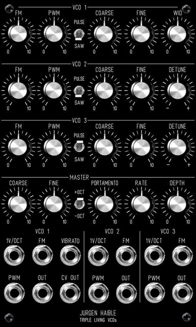 This 3U panel design features VCO controls in a vertical format. There is a master 1V/Oct input. The CV Out is normalled to the other two VCOs as are the FM inputs. There are master Width and PWM controls and a single PWM input. Detune controls are only on VCO2 and VCO3. Each VCO has a separate output and there is a mixer with individual attenuators for a mix output.