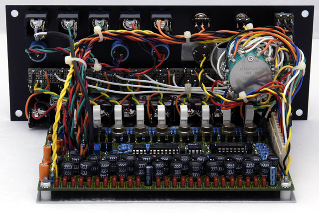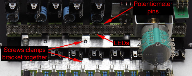 The panel is very dense and there is little room to mount a conventional PCB bracket under the controls. I fabricated a straight bracket that clamps to the 9 jacks to mount the PCB. The select switch mounts on a bracket for clearance to the nearby front panel components. A coupler and 1/4" rod extends the shaft through the front panel. A perfboard is used to fasten the fragile potentiometer pins and mount the 3 mm LEDs which illuminate the rear of the clear shafts.