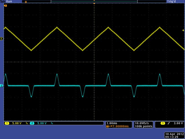 In this example I have set In 1 to -5 volts and In 9 to +5 volts and am driving the Scan with a triangle waveform (yellow). The output (cyan) is a +/- 5 volt rounded pulse at the peaks of the triangle waveform.