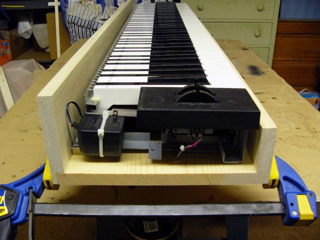 I designed two small FrontPanelExpress panels for the keyboard - one for mains power, fuse and switch, and the other for MIDI and pedal jacks. I used an internal 9 volt DC wall wart power supply for the keyboard controller as it only draws 170 mA. I built a cabinet from poplar with a pine bottom. In the photo I have the main portion assembled with a 1/2" riser at the rear to level the keyboard to a horizontal position. I welded a small frame to attach the pitch bend and modulation wheel module to the keyboard and also support the internal power supply.
