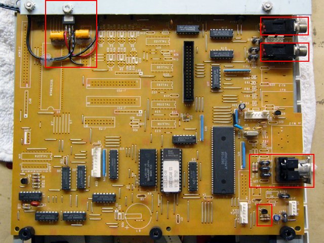 There were 'unstuffed' part locations for a MIDI out jack and two 1/4" pedal jacks. I took these parts from the main controller and traced out the unused circuitry which implemented an emitter follower to buffer MIDI out. I decided to not use the key transpose switch (later determined to be a bad decision) nor the general purpose MIDI slider. I did add a +5 volt regulator on the board so I could power this with a 9 volt DC power supply. This gives me a fully functional MIDI keyboard controller. Here is a photo of the completed pcb with the parts I added outlined in red.