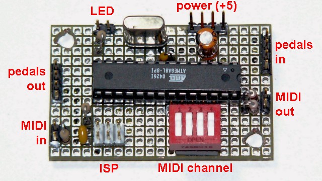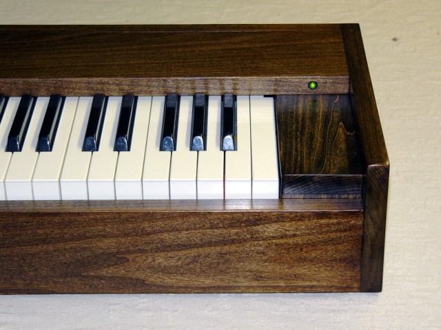 The photo on the left show the rear jack panel which is set flush into the cabinet. Inside on the right is a small microcontroller board which processes MIDI and pedal signals. I used an Atmel ATMEGA8 microcontroller. This controller inverts the pedal signals to use normally-open pedals and transposes the keyboard by 5 semitones. It also replaces the MIDI channel information with the DIP switch selection. The LED provides a power-on indication and blinks briefly for each key depression.