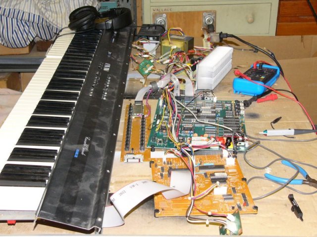 Kurzweil graciously provided most of the schematics but I was unable to repair it. The 68000 microprocessor 'hung' whenever accessing the proprietary 'Arnold' sound chips. I was unable to locate any information on diagnostics and the schematics were incomplete in this area. Here's all of the parts spread out on my bench.