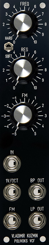 This wave file demonstrates the LP output. The MOTM-300 is driving the Polivoks filter with an AR generator into the FM input. I sweep the frequency, soft resonance, hard resonance, and FM input controls. You can hear the hard resonance break into clipping around 0:49 and again at 1:50.