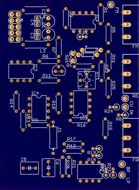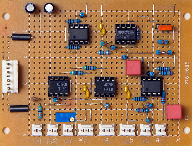 I repaired a Polivoks filter and was intrigued by the use of programmable op-amps for the filter cell. The Polivoks filter is derived from the Polivoks synthesizer designed in the early 1980s and uses the Russian K140УД12 programmable op-amp which is equivalent to the obsolete uA776. There are at least three Electro-Music forum postings on the Polivoks filter Polivoks Filter, Building The Polivoks Filter, Polivoks VCF Simple Schematic Layout, and a Muffwiggler forum on Papareil Polivoks Filter Support Thread. There is also an interview with Vladimir Kuzmin from the Urals Vector Company on the Polivoks synthesizer. This is the Marc Bareille Polivoks filter PCB I repaired which used the Russian УД1208 and KP140УД85 op-amps and the KT315Г transistor.