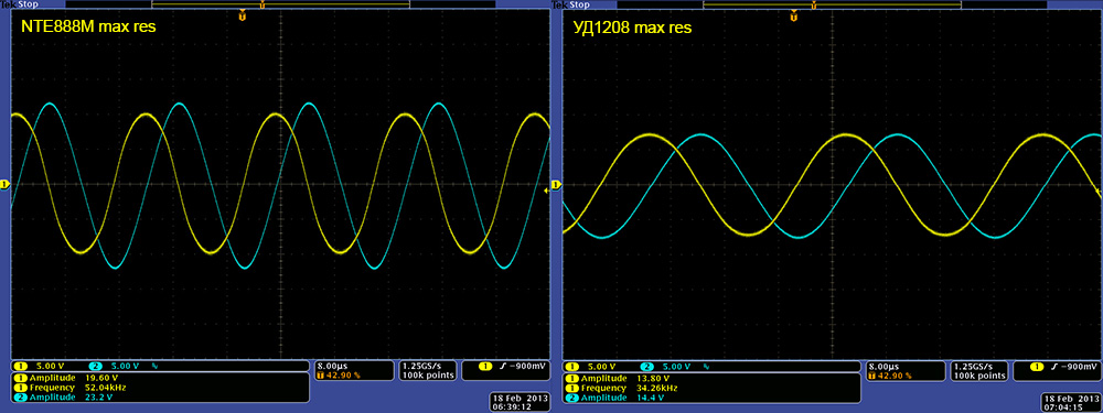 This image shows the maximum resonance using the frequency control with the NTE888M and the УД1208 parts with the soft limiting. The УД1208 parts exhibited the same shift to lower frequencies and lower amplitude. Changing the KP140УД85 and KT315Г to a TL071 and 2N3904 decreased the NTE888M maximum frequency 1% to 51.4 KHz.