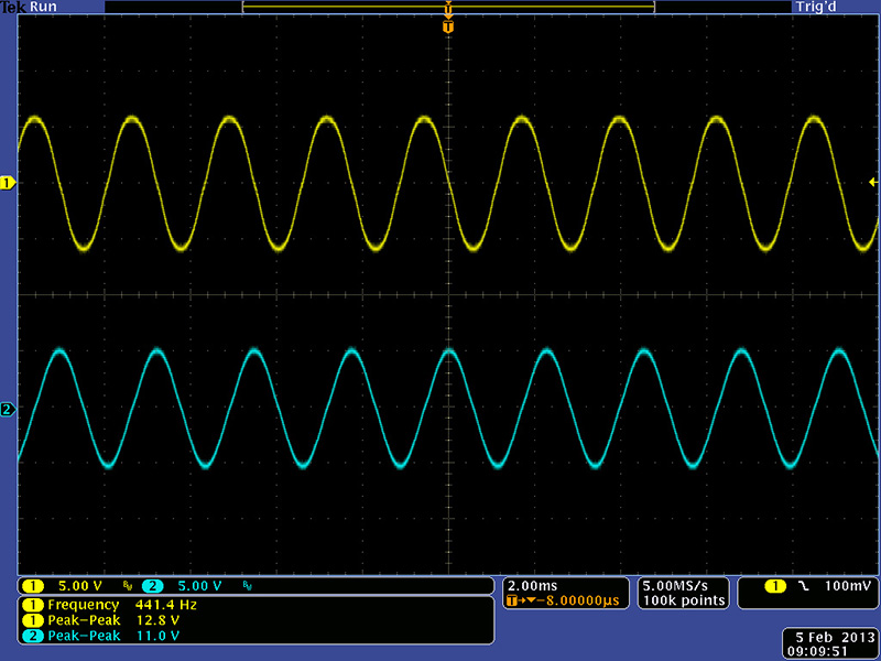 The УД1208 band pass output with the same resonance setting. The lower center frequency is easier to see with the peaked response.