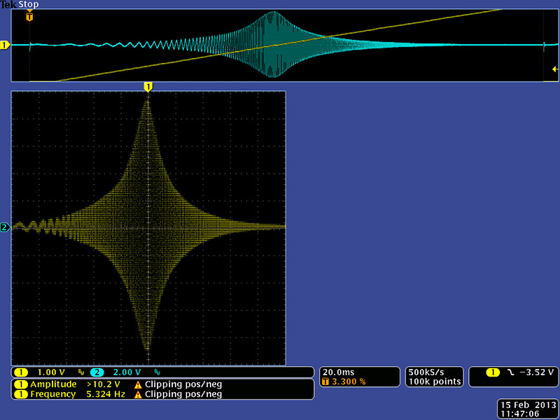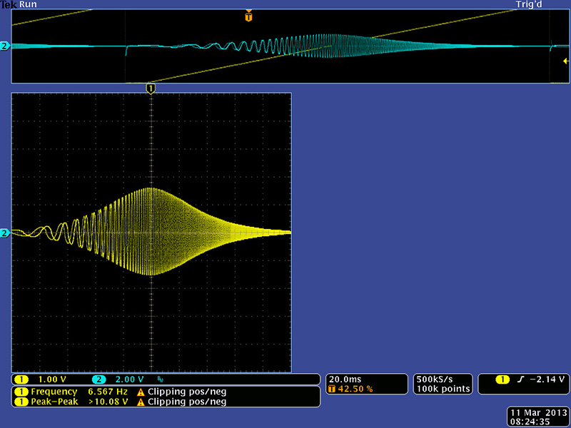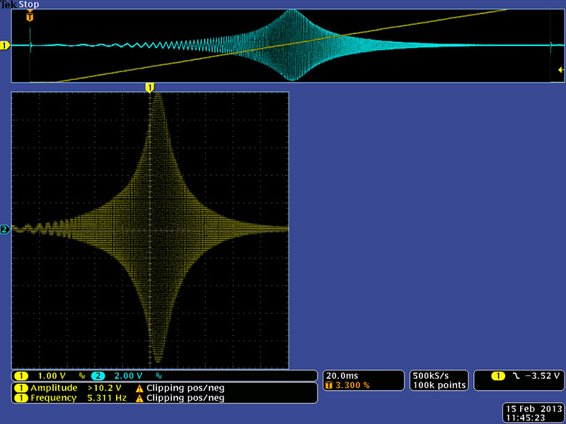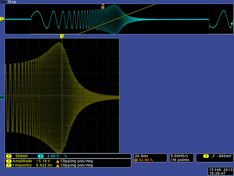 This image shows the uA776 maximum resonance using the frequency control with soft limiting. It is not quite as high as the NTE888M parts but the band pass begins to show distortion.