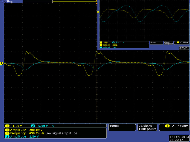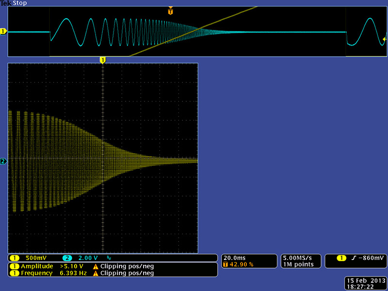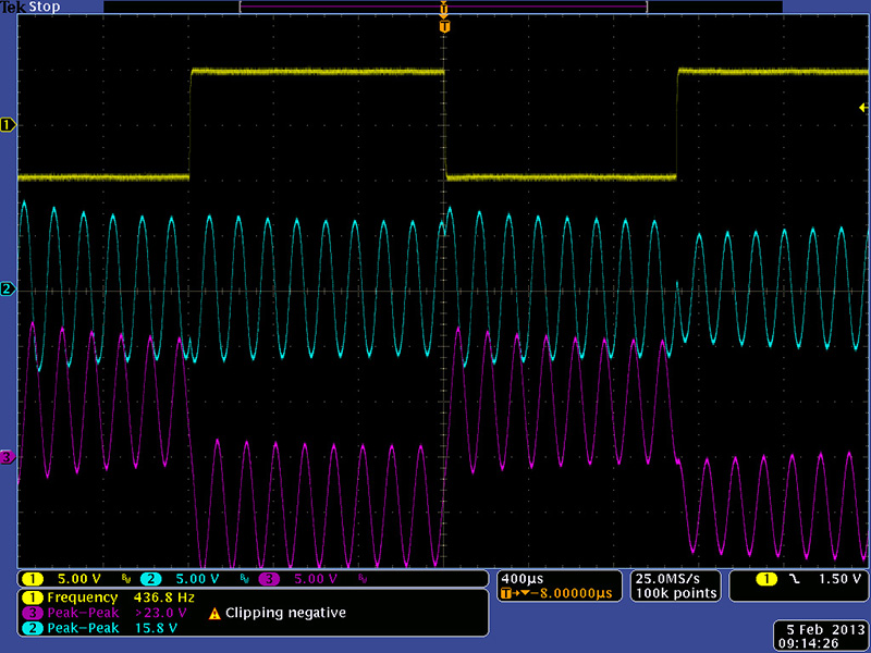 This image shows the original resonance with a square wave input. The output is rail to rail and the self-resonance totally swamps out the square wave input.