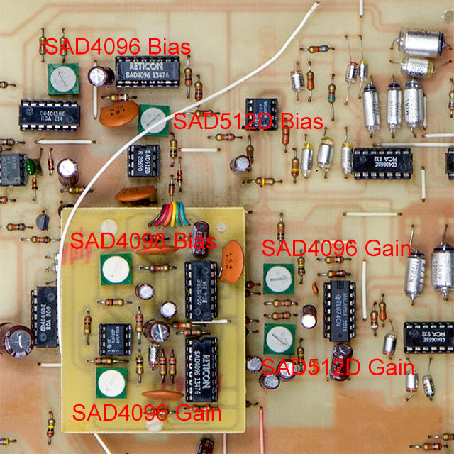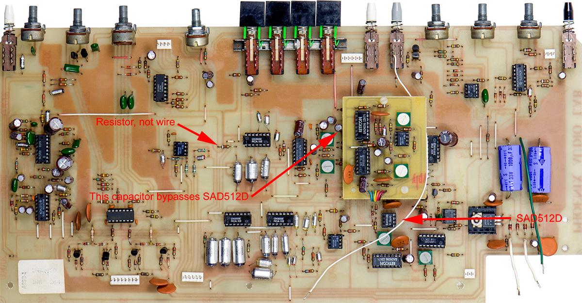 I replaced a number of bad parts and got the unit working nicely for delays/echo but not flange since the SAD512D was dead. I did find two interesting issues. The first was there was a nicely done factory-looking modification that bypassed the SAD512D with a capacitor (short white wire on the rear of the PCB just above the delay switches). Removing this wire and a replacement SAD512 from a donor DOD 575 Flanger pedal restored the Loft 450 to full operation.