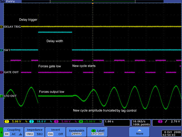 It took me a bit to understand the delay trigger functionality. A delay trigger forces the gate low and attenuates the output until the delay is complete when a new output cycle begins with a new trigger and gate output.