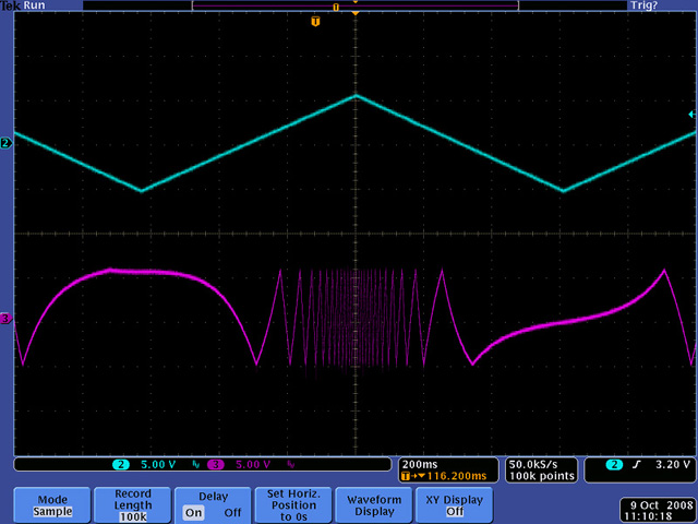 This scope image shows the LFO output modulated by a low frequency triangle wave on the FM input.