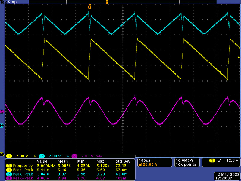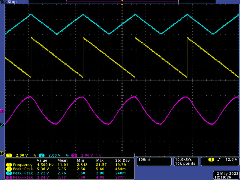This module took a fair amount of work to operate the way I thought it should. The saw core was way too low in amplitude which I corrected by widening the reset pulse so it would reset to +15V. That increased the glitch formed by the rising edge in the triangle circuit which propagated to the sine wave output. I made some additional modifications to minimize the glitch and adjust the frequency range to 5 Hz to 5 KHz. The sine wave output was low in amplitude so I increased to a more standard 4V pk-pk output. This image shows the saw, triangle, and sine at 5 Hz.