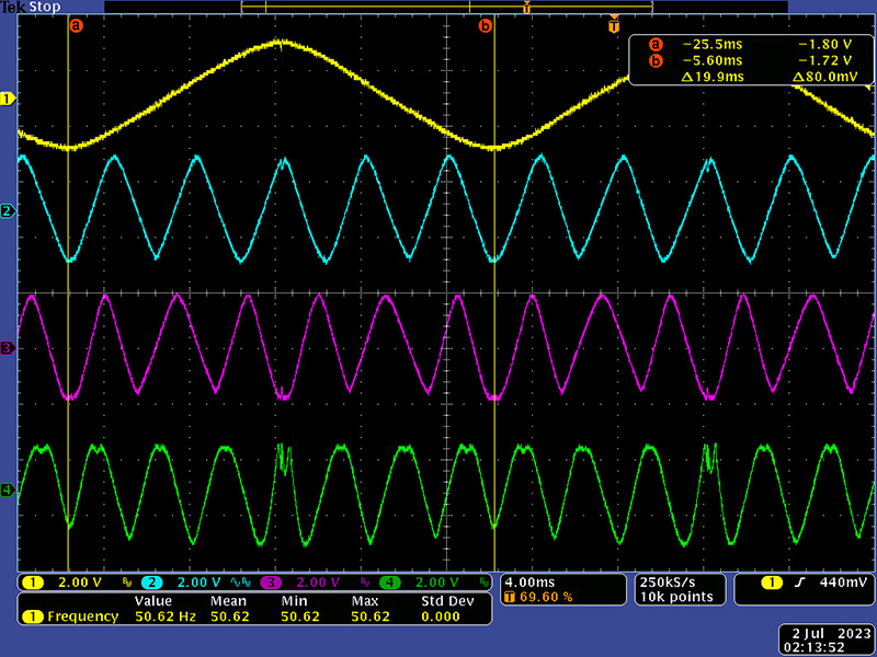 The module has three distinct circuits - oscillator, frequency doubler, and wave folders. The X2, X4, X6, X8, and X10 operate with frequency doublers. The X3, X5, X7 and X9 waveforms are generated with wavefolders. They are very sensitive to fold and clamp levels. The notch in the sine ripples through all the waveforms. I also increased the gain for more standard Buchla output levels. This scope image shows the 1X, 2X, 3X, and 4X sine outputs.
