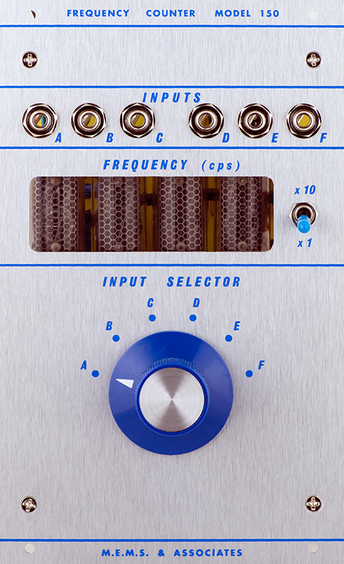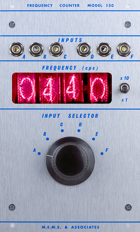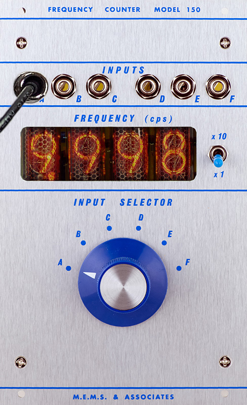 Four nixie tubes display the frequency of up to 16 selectable inputs, 6 from the front panel, and the other 10 from a rear connector.