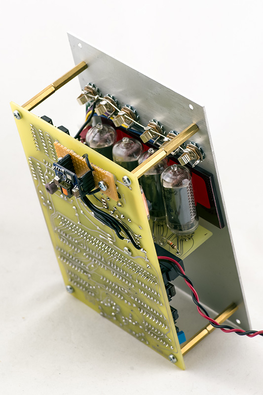 This photo shows the construction with a logic PCB parallel to the panel and a short Nixie plug-in PCB. The high voltage DC-DC converter is mounted on the rear.