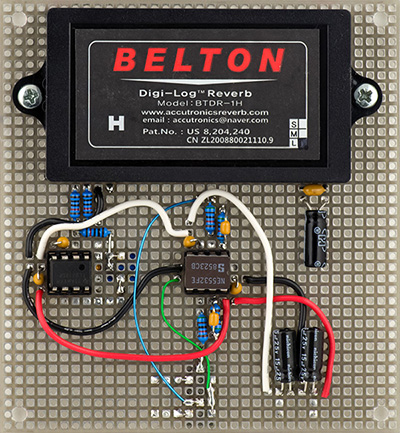 Rather than mount the Reverb-Headphone PCB and springs in a separate enclosure, an aluminum plate on the rear is used for those components. The headphone amplifier is provides more power than is needed, and the spring reverb tank takes up room. I have plenty of spring reverbs so decided to design my own board using the Belton BTDR-1H module. It sounds quite nice and will operate to low frequencies. The headphone amplifier is just a simply driver using a NE5532 op-amp, similar to my 5U headphone amplifier.