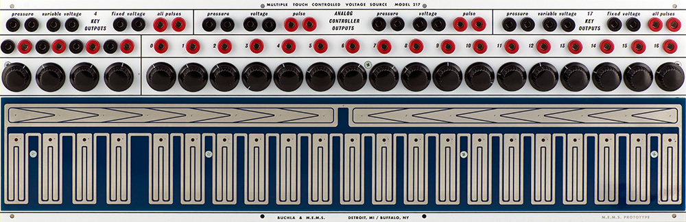 A similar 4 key section has the above features plus individual pressure outputs for each key. Two analogue controllers provide output voltages that are proportional to lateral position.; they also feature pressure and pulse outputs.