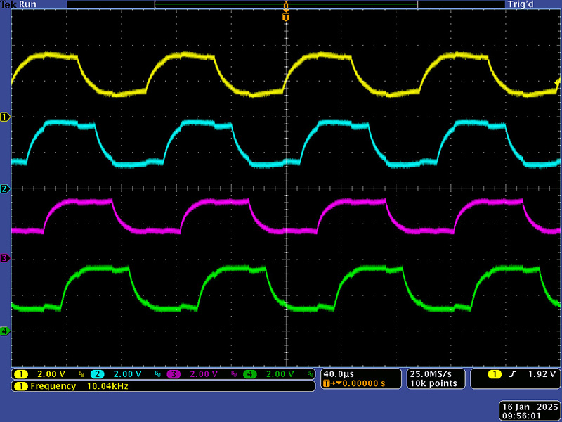 The linear control surfaces are interesting. A 80 KHz clock drives a shift register that generates 8 different square waves that connect to the 8 segments. Each square wave is operating at a 10 KHz cycle but shifted by 12.5 uS, the period of the 80 KHz master clock. These are the waveforms for the first 4 touch pads.