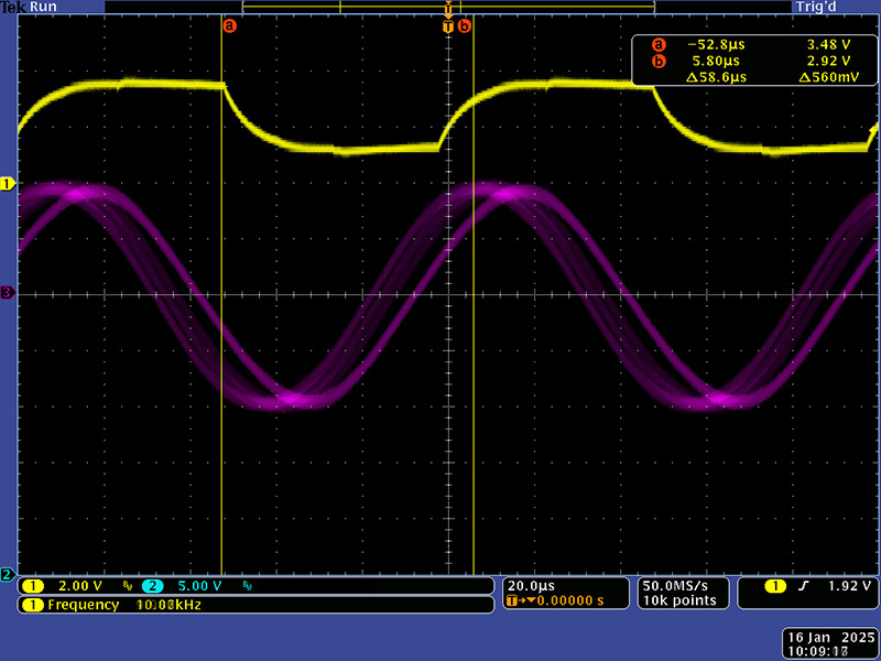 Summed together, they form an 80 KHz "sine" wave that increases in amplitude when the pads are touched. As you slide from minimum to maximum, the phase of the sine wave shifts. The phase between this sine wave and the master clock determines the linear position. At minimum, there is minimal shift but as you slide towards maximum, the time/distance increases. This superposition of four different images shows the sine phase changing as your finger slides along the touch pads.