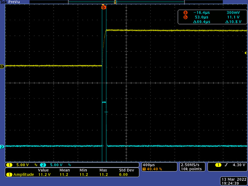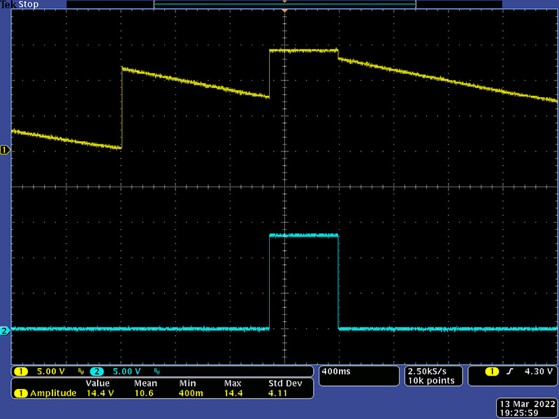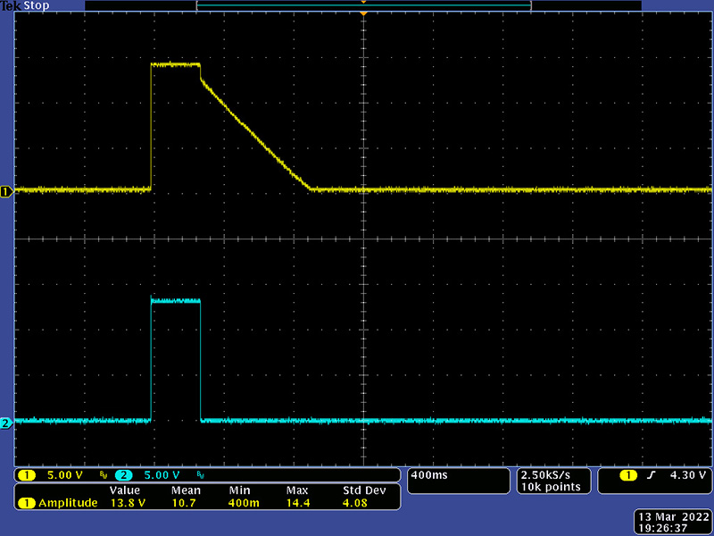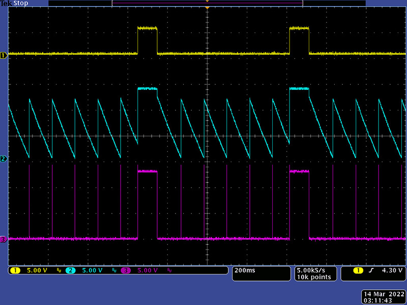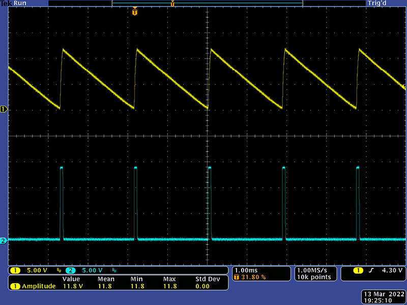 The photo shows the press of the Single Cycle button while stopped. You can see the pulse width matches the duration of the button press followed by the ramp decay based on the Period control.