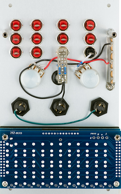 There are a lot of wires in this module. The PCB and matrix cover the entire panel. There is a notch in PCB1 for wiring from PCB2 to the front panel. There is also a notch in PCB2 which serves no purpose. In this photo you can see my two diodes for the violet color for a single press. You can also see the series resistor and diode along with a three pin jumper for the ramp output/external clock input selection.