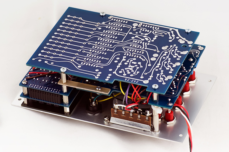 The matrix board in the MEMs reproduction is made from a sandwich of three PCBs with through-connectors oriented in the horizontal and vertical axes and a mix of thru-hole and SMT components.