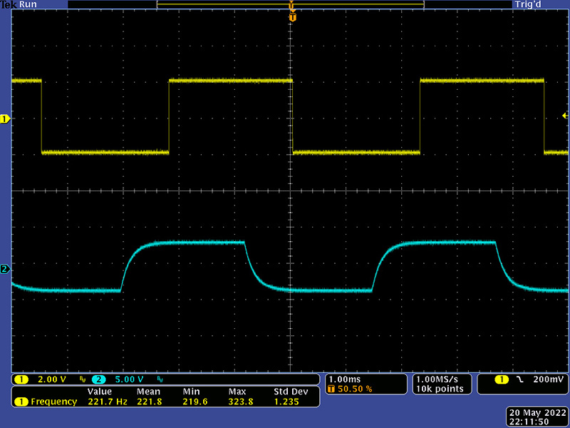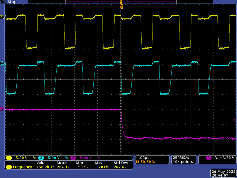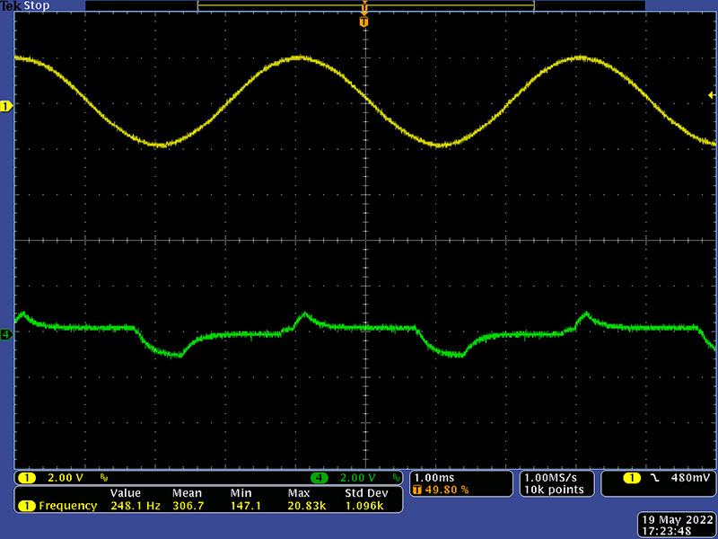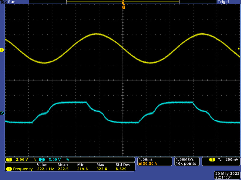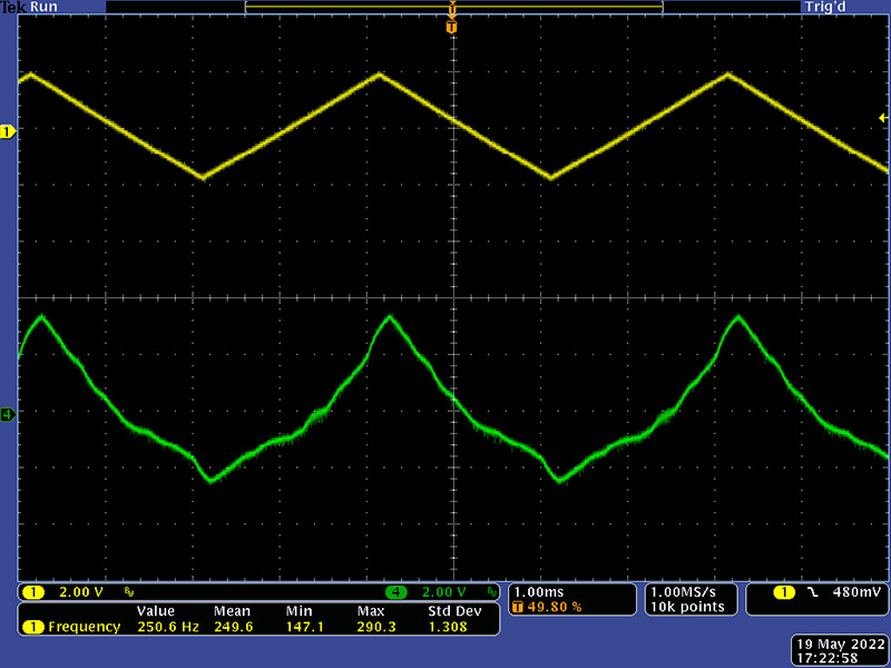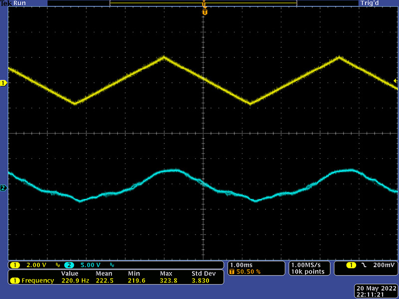The VCO has become unstable above 230 KHz which corresponds to a CV of ~0V. With everything now functional there is a lot more noise throughout the system. The Sigma-Delta A/D runs on both clock edges and the 48 shift registers clocks now have steeper rise/fall times. At the maximum frequency, the triangle core is at the lowest amplitude and the waveform has ripples corresponding to the noise. There are wires running everywhere on this module and there is no power supply decoupling.