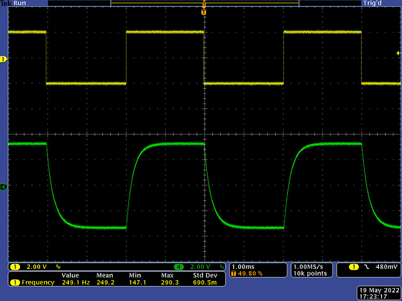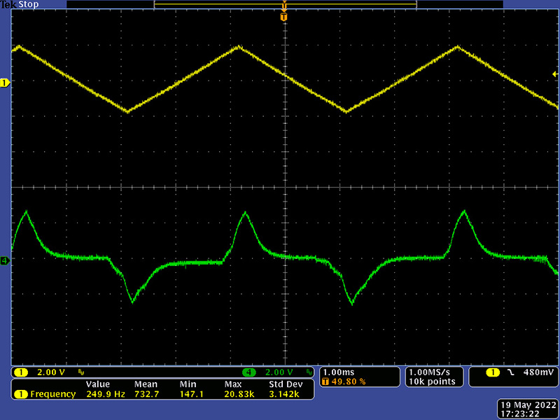 This video is a swept triangle signal with feedback of the T signal at maximum delay. The oscilloscope is displaying the input and T signal output.