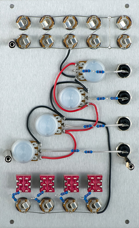 The original used terminal strips for power and the CV resistor but I decided this was unnecessary. The potentiometers have +15 and Ground and their terminals can be used to distribute these wires. -15 is only used on the PCB so can simply connect there. The resistors are sufficiently rigid to allow connections of the various wires.