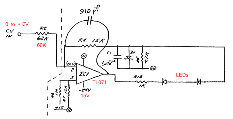 I breadboarded this control circuit and drove it from a 13V unipolar triangle wave at 1 Hz to better understand the vactrol current. I used red LEDs and a TL071 powered from 0/-15V for this investigation. I reduced the input resistor slightly to give me a comparable CV range of 0 to +13.5V.