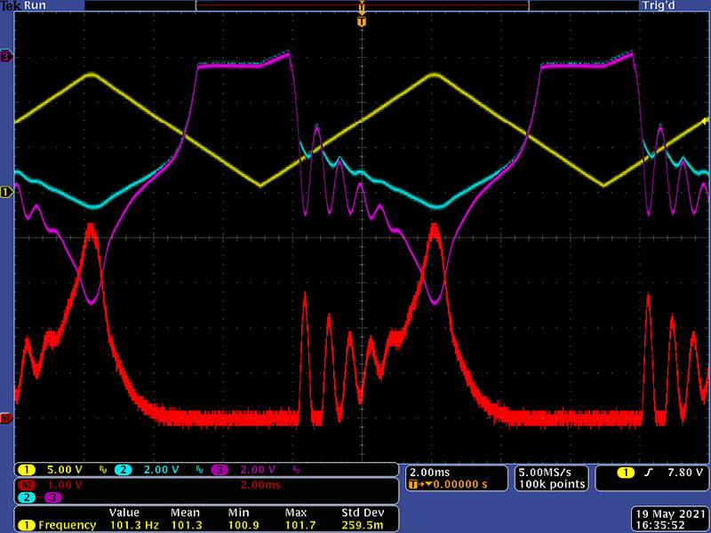 This scope image shows my triangle CV (yellow) and the voltages on each side of R13 (cyan and magenta). The red is the resultant voltage across R13 by subtracting these two voltages. Since R13 is 1K and the scale is 1V/Div you can read the red trace directly as 1 mA/Div of vactrol current.