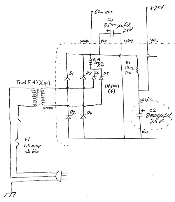 The 311 operates by providing a phase controlled pulse to turn on an SCR. SCRs operate on DC so are driven by a bridge rectifier and provide DC partial half-sine waveforms to the load, in this case lights. The 311 requires a 120 Hz half-sine waveform provided by the linear power supply. This partial schematic of the 115A power supply shows the extra two diodes to provide the 120 Hz half-sine reference waveform (labeled 60~ REF).