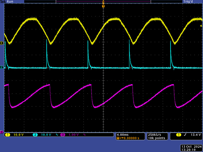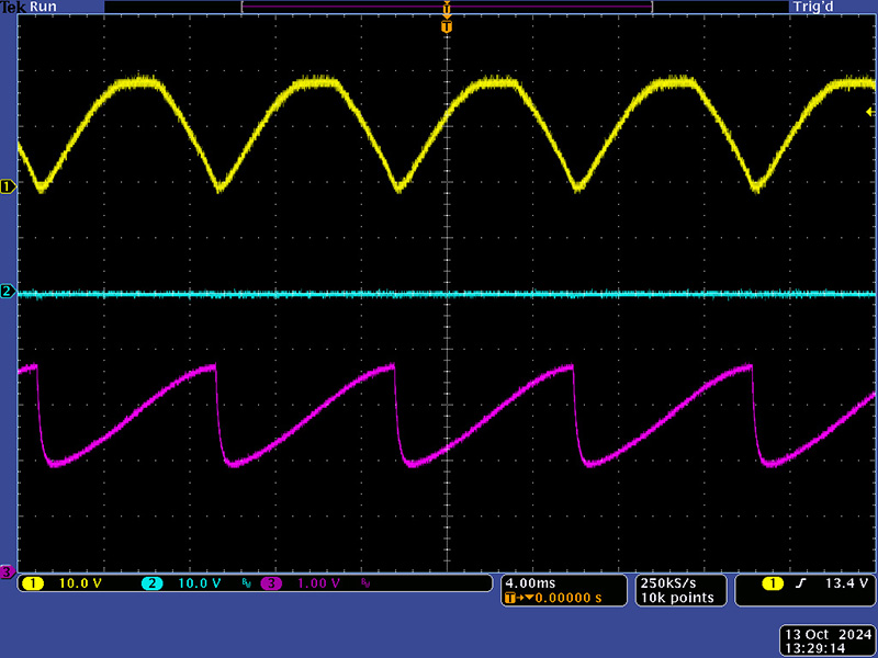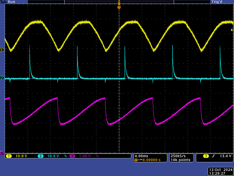 These waveforms show one of the output channels from the 311. The Master control is set to maximum so the output pulse can shift over the entire cycle. This scope image shows the 120 Hz half-sine input (yellow), the 311 channel output (cyan) and a 60~ Ref Out (magenta) for driving other modules. The channel control is off so there is no output pulse.
