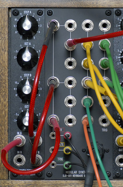 This is an interface module for my ARP-3604 keyboard. It consists of multiples with 1/8" jacks (for the ARP and to daisy chain to my Odyssey / Avatar) and 1/4" jacks for CV, Trigger, and Gate. The CV jacks allow connection to the JLH-822 V-Shift module on the left prior to two sections of multiples. The module also provides power and signal connections for the Arp-3604 keyboard.