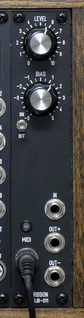OUT-1 is a 0 to 10 volt control voltage which returns to 5 volts when there is no contact with the ribbon. A 10K potentiometer connected to IN-1 provides a fine adjustment of the no-contact voltage. I generally use a level shift module on the output to provide a +/- 5 volt range and use the offset adjustment so there is no detuning when the ribbon is connected to the FM inputs of a VCO. The output defaults to the right-most position if more than one area on the ribbon is in contact.
