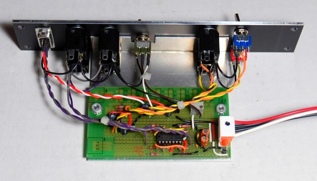 I used a scrap portion of a MOTM-000 prototype PCB to build the module and a custom aluminum bracket to mount it to the two jacks.