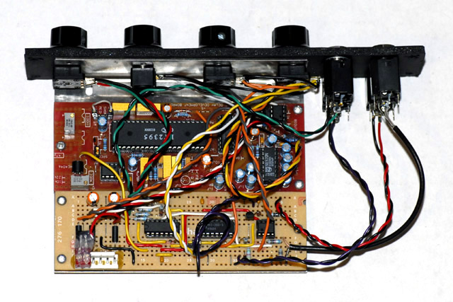 This is a photo of a completed prototype built with a foam-core prototype panel. The lower looped wire is for the bypass switch which is not installed. I added a 7805 regulator on a 2 pin MTA housing so I could operate this module from a 4 pin MOTM +/15 volt system.