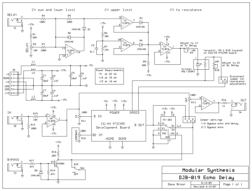 I built this module around the CGS-44 PT2395 Delay Development board and designed additional support circuitry for CV controlled delay and bypass, gain and loopback controls for echo, and an output mix control. This architecture is very similar to my DJB-012 Tape Interface