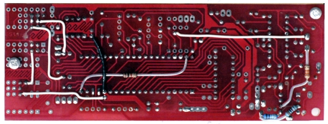 This photo shows the rear of the CGS-44 Delay Development board with the modifications for the input and output buffers, varactol, and adjustment trimmers. The black wire is a digital ground which was cut when the board was shortened.