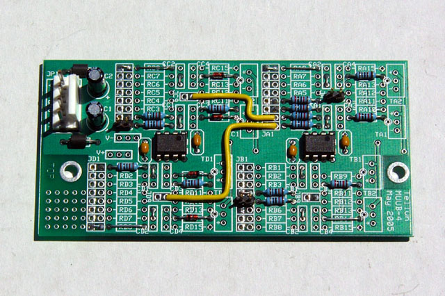 This is a photo of the assembled MUUB-4 which will mount as a daughterboard on a MOTM-890 uMixer.