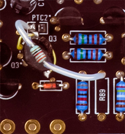 The number one problem I find in doing DIY module repairs is soldering issues: unsoldered pins, incomplete soldering, or solder bridges. You have to wash and carefully inspect every pad with magnification to find these. Here is an example of a resistor lead that did not properly wet and solder. This was a very intermittent connection that took some time to find. I was able to pull the resistor lead from the top side of the PCB out from the pad.