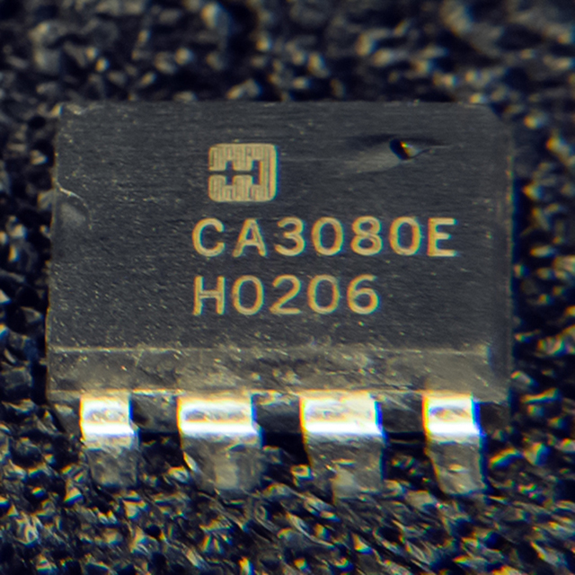 I recently got several of this vintage CA3080E in PDIP packages. Three of the four did not work. This defective one has a bubble on top as if it has been recoated and delaminated. I pricked the bubble with a pin to verify it was delamination. I have never seen an authentic part with this type of defect. I don't know when Harris phased out the CA3080E but this date code of 2002 seems a bit late. Usually there is more space between the H and the date code. Acetone did remove a black topcoat but the label underneath was the same. Another part with this same date code and marking is good.