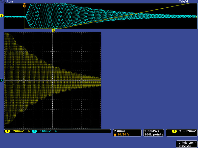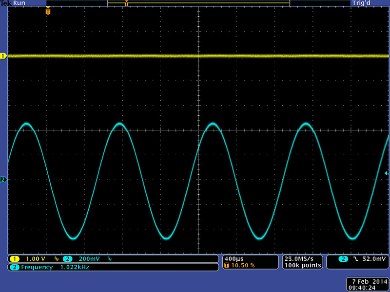 This scope image shows the nice sine wave output of self-resonance oscillation.