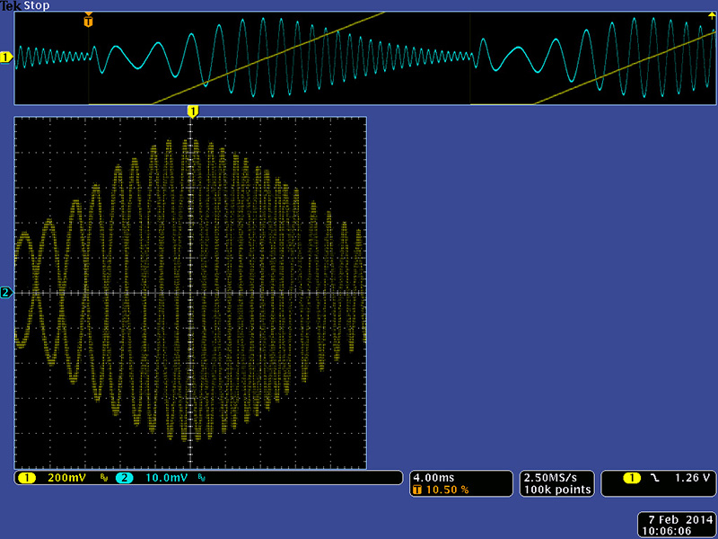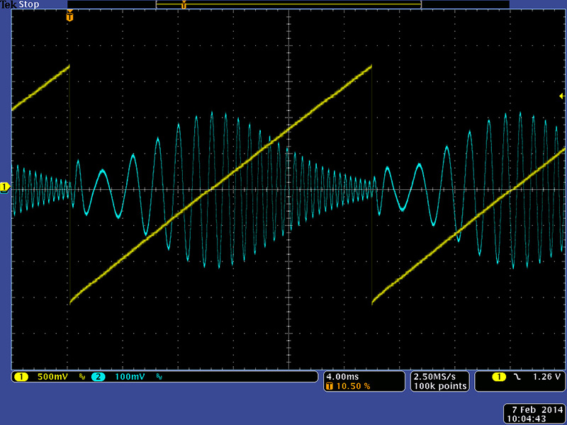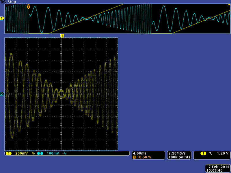 This scope image show the frequency response of the band reject mode.