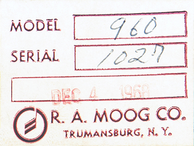 The serial number label indicates a Dec 4, 1968 date code. Moog did not give modules serial numbers until 1967 and started at serial 1001 so this is the 27th 960 produced after assigning serial numbers.
